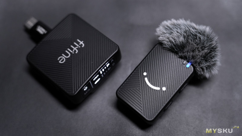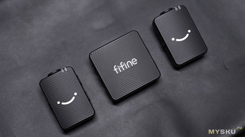 Микрофоны имеют прямоугольную форму с символическими логотипами бренда в виде стилизованной улыбки, а передатчик квадратную форму с наименованием бренда.