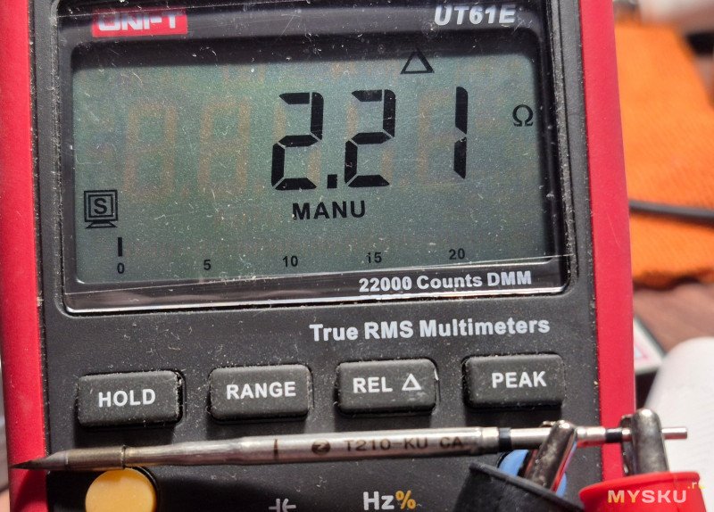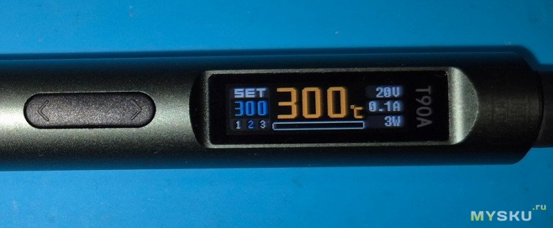 Если проигнорировать, то через 15 секунд паяльник отключится. Но я брал не для того чтобы игнорировать, поэтому жму кнопку. С комнатной температуры до 300 градусов паяльник разогревает комплектное жало KU(топорик) за 3 секунды.