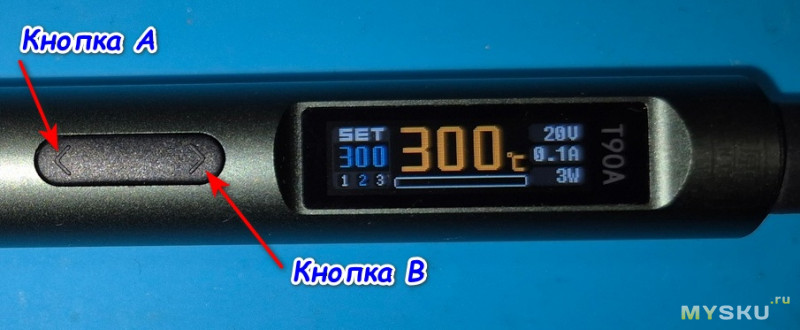 На основном экране длительное нажатие кнопки «А» переключает по кругу температурные профили. Длительное нажатие кнокп «В» переводит девайс в режим сна. Короткие нажатия кнопок А и В увеличивает/уменьшает с заданным шагом температуру нагрева жала.