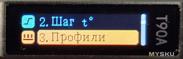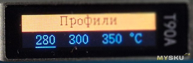 На основном экране длительное нажатие кнопки «А» переключает по кругу температурные профили. Длительное нажатие кнокп «В» переводит девайс в режим сна. Короткие нажатия кнопок А и В увеличивает/уменьшает с заданным шагом температуру нагрева жала.Исследуем меню...