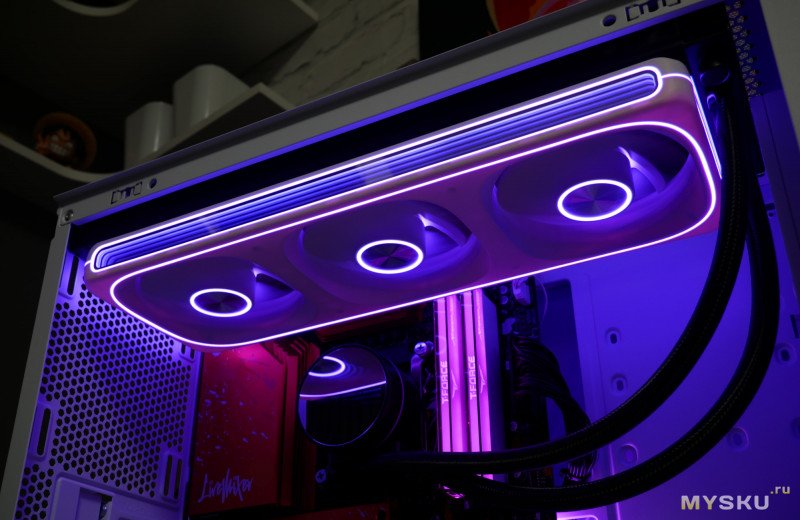 Пример установки и сборки модуля вентиляторов Formula V Air Fusion 3 в компьютере на радиаторе СЖО сверху на выдув. У комплекта аж восемь зон подсветки, начиная от колец роторов, заканчивая боковыми вставками с зеркальным эффектом. Вживую смотрится это очень волшебно, особенно если вам нравится подсветка.