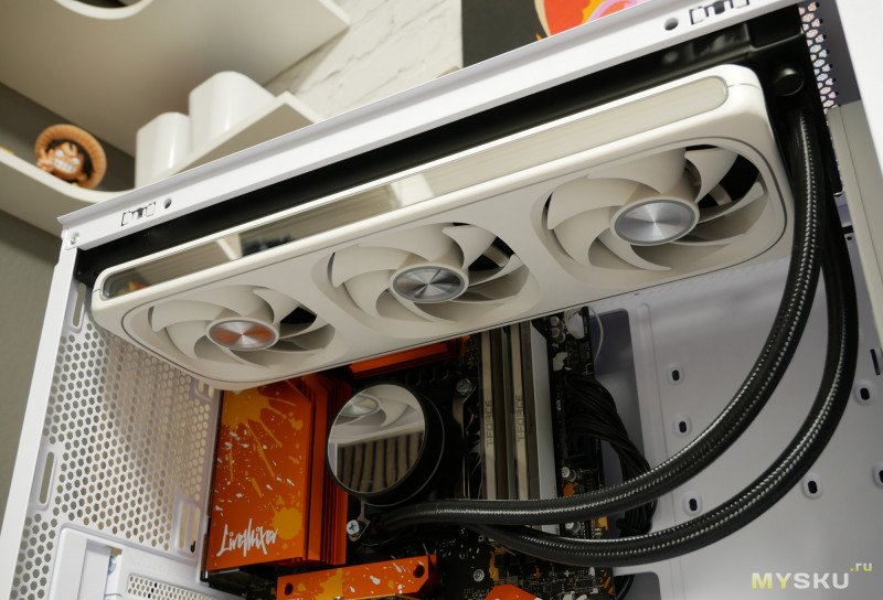 В корпусе установлен наиболее оптимальный режим вентиляторов: три спереди на вдув и три сверху на выдув.