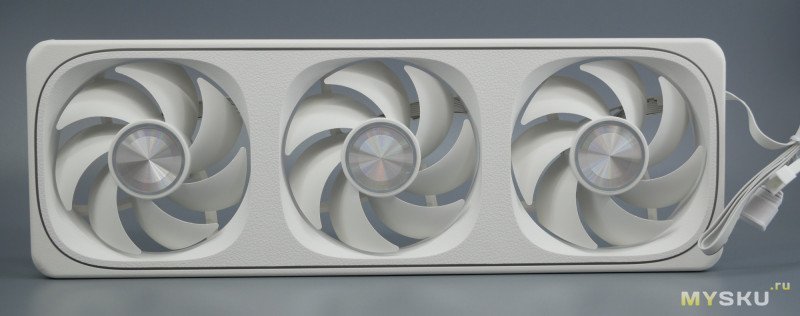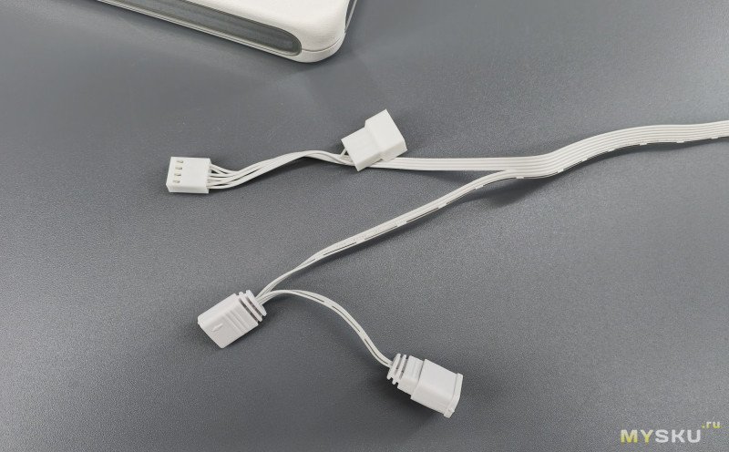 У модуля предусмотрено подключение к компьютеру или контроллеру через длинный белый кабель, на конце которого два Y-разветвителя с соединением 4-pin PWM и ARGB подсветки.