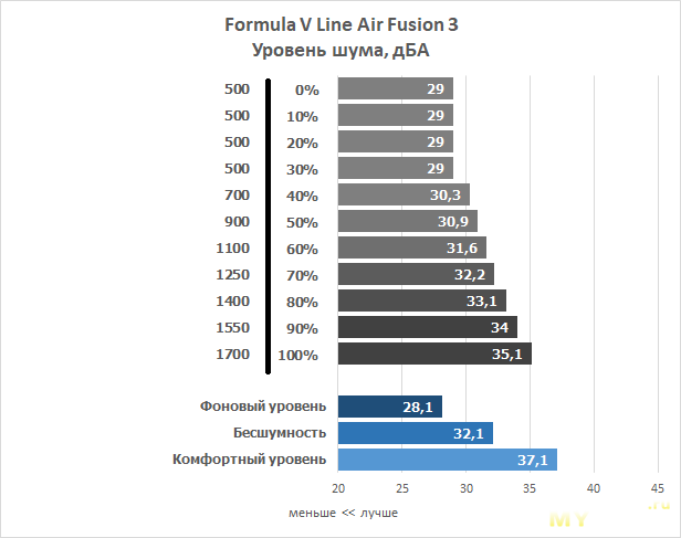 В процессе тестирования удалось установить, что скорость вращения в моем случае составила от 500 об/мин до 1700 об/мин. Воздушный поток средний, немного слабенький для охлаждения СЖО. Но в качестве корпусного решения на вдув или выдув, я думаю, Formula V Air Fusion 3 будет очень неплохим вариантом: к тому же в сети я уже находил сборки ПК полностью на данных вертушках. Я могу назвать их тихими до 1000 об/мин и комфортными до 1500 об/мин.