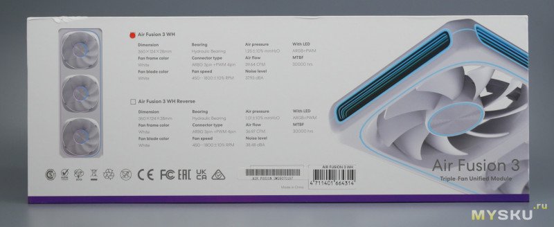 Комплект вентиляторов поставляется в оригинальной упаковке из толстого картона с очень плотными стенками. Выполнена она стильно, даже премиально.