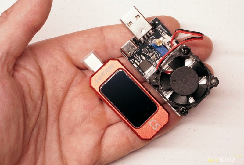 Конструктивно, у нагрузки есть разьёмы type-a и type-c, их "+" и "-" включены параллельно. Взаимное расположение портов крайне неудачное для type-c. Ни один USB-тестер туда не запихнешь, даже такой компактный как KWS-2301C. Только кабель или какой-то уж совсем мелкий показометр. И это не очень-то удобно. Лучше бы они его развернули на боковую сторону платы, тогда всем было-бы хорошо. Кстати, резисторы тут распаяны и при подключении к type-c напрямую, 5В на разъеме есть.
