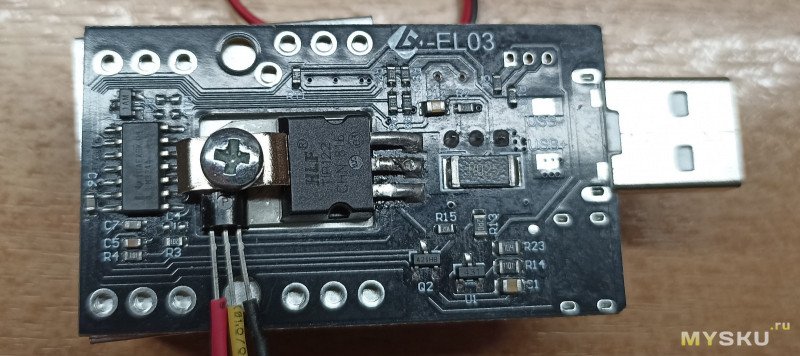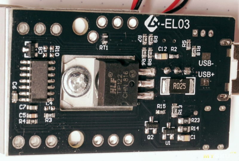 На нижней стороне платы имеется шунт на 25 мОм и какая-то микросхема sop-14 с затертой маркировкой. Можно предположить, что это lm324: к 4 ноге подключен +usb, а к 11-ой -usb. Если так, то странно, зачем это скрывать? У подобной же в версии с lm358 на 18Вт маркировку не затирают. Есть тут и Tl431, видимо для задания опорного напряжения. Ещё пара транзисторов, возможно один или оба задействованы в схеме управления вентилятором — он автоматически включается при нагреве силового транзистора. Силовой транзистор установлен на нижней стороне платы, в квадратном «окошке» и прикручен винтом м3 к дну радиатора. Или, скорее, радиатор к нему. Транзистор составной (Дарлингтон) — TIP122, 5А 100В, 65Вт. ДШ: https://static.chipdip.ru/lib/576/DOC011576293.pdf