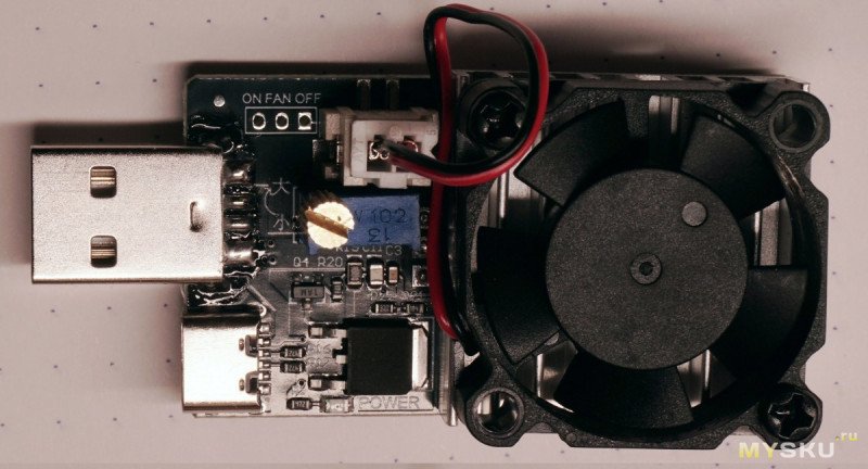 Конструктивно, у нагрузки есть разьёмы type-a и type-c, их "+" и "-" включены параллельно. Взаимное расположение портов крайне неудачное для type-c. Ни один USB-тестер туда не запихнешь, даже такой компактный как KWS-2301C. Только кабель или какой-то уж совсем мелкий показометр. И это не очень-то удобно. Лучше бы они его развернули на боковую сторону платы, тогда всем было-бы хорошо. Кстати, резисторы тут распаяны и при подключении к type-c напрямую, 5В на разъеме есть.Ещё на верхней стороне платы есть: 2p JST разъем питания вентилятора, отверстия для установки перемычек принудительного включения или отключения вентилятора, подстроечный многооборотный резистор с накатанной крутящейся головкой, похожий на MOSFET элемент в корпусе dpak с затертой маркировкой и светодиод индикации включения нагрузки/питания. Да, отдельного питания тут не предусмотрено, схема нагрузки питается от нагружаемого источника.