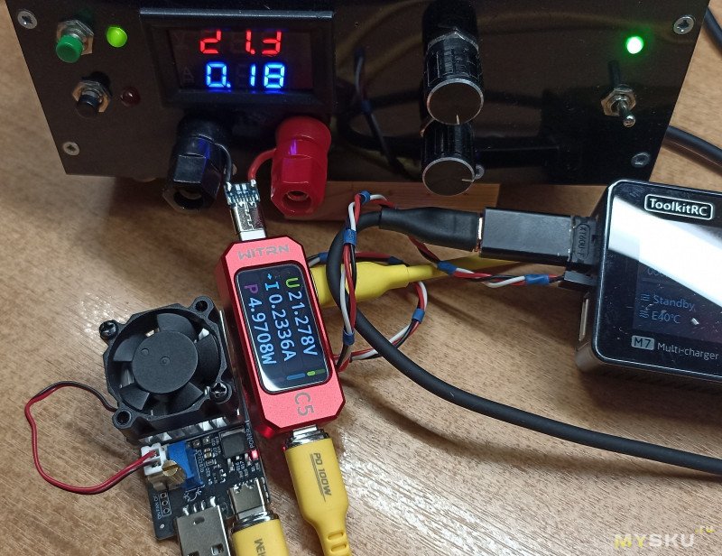 Для тестов использовал свой регулируемый БП, его для таких целей должно хватать более чем. А между ним и нагрузкой будет USB-тестер Witrn С5 для индикации тока-напряжения-мощности.В отзывах есть фото со сгоревшим транзистором и выводами, что нагрузка ни 20В не держит, ни 1.5А. Немного понагружал нагрузку на токах 1.5А и 12В, сразу не сгорела, но транзистор ощутимо греется. Решил проверить 20В, выставил на БП 19.9В и ограничение тока в 4А, на нагрузке был выставлен минимальный ток. Подключил выход БП и сразу получил 2.5В и 3.24А. Не сразу понял, что произошло, а потом как понял. Что нагрузка уже «сгорела». Вот так сразу. Правда, сгорела она не до конца а перешла в режим своего постоянного максимума, т.е. те самые 3.24А.