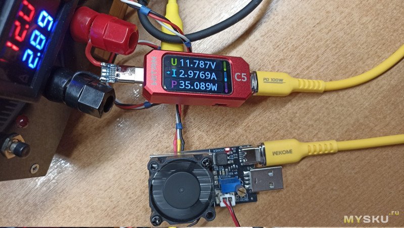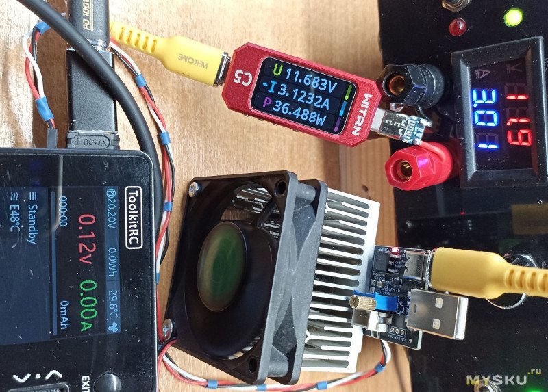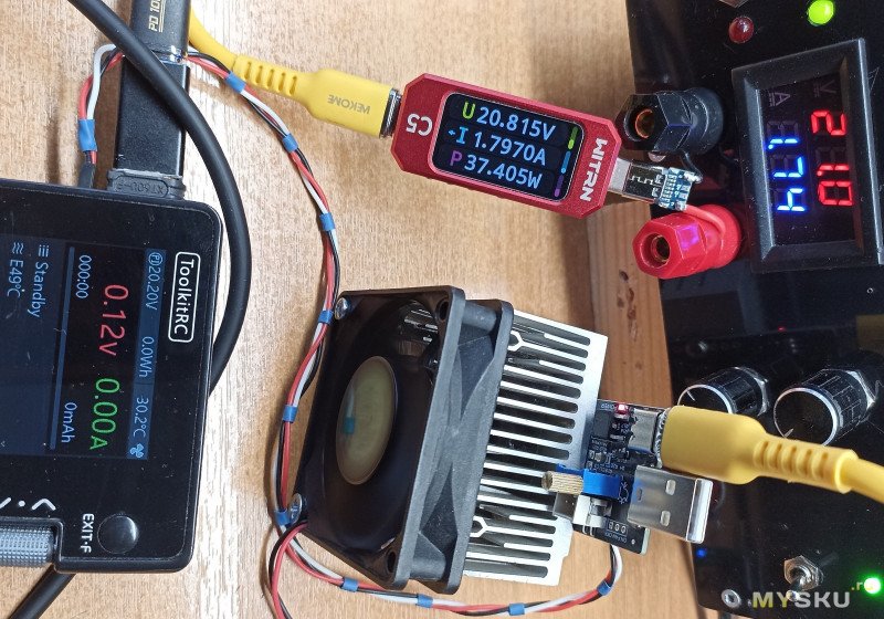 Вентилятор, кстати потребляет больше ~300мА и включается на 40 градусов. И выключается, надо бы ему гистерезис увеличить, тут на муське был обзор и описание, как это сделать, может поможет.На 5В дает выставить не более 3А, и всё равно перегревается до 70 градусов, дальше не стал проверять.