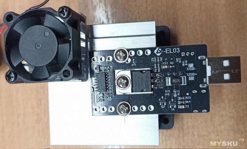 Т.е. если транзистор не подделка, есть все предпосылки, чтобы заявленные 25 Вт рассеивать долго и счастливо. Но вот, думаю, что установленный тут радиатор и вентилятор маловаты для рассеивания 25Вт, на Али, кстати, пишут про 22.5Вт для этой нагрузки. Но и это, думаю, тоже безудержный оптимизм с таким радиатором, сомневаюсь, что он сможет рассеивать многим больше 10 Вт. Штош, проверим: давайте уже нагрузим эту нагрузку ;)