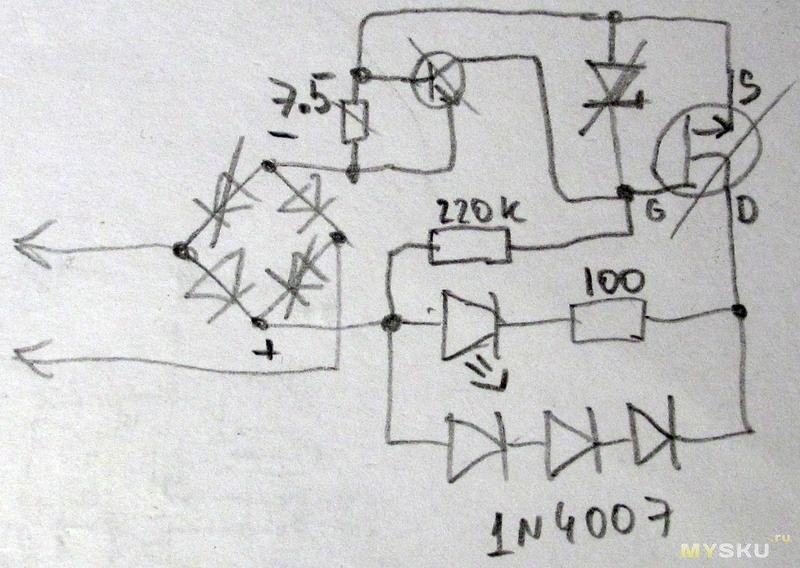 половина диодов моста, токозадающий резистор, транзистор, стабилитрон и силовой полевик. На удивление цепочка 4007 диодов, через которые тоже шел ток кз, остались целые.Срисовал схему (номинал стабилитрона неизвестен, но очевидно слегка ниже допустимого напряжения затвор-исток, вольт эдак 15), пострадавшие перечеркнуты: