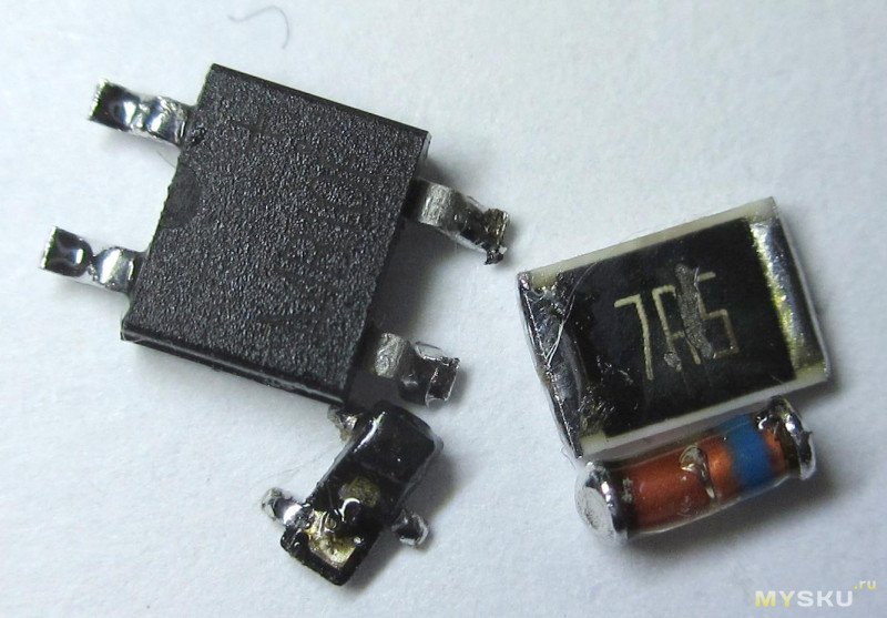 половина диодов моста, токозадающий резистор, транзистор, стабилитрон и силовой полевик. На удивление цепочка 4007 диодов, через которые тоже шел ток кз, остались целые.