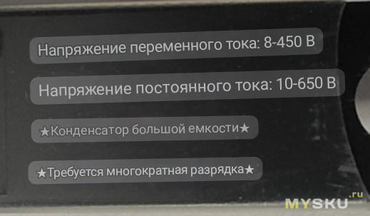 Заявлена работа на постоянном токе 10-650В, на переменном 8-450В.