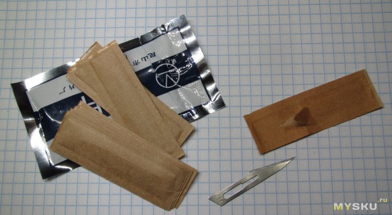 В комплекте у нас сам ножик, стальное колечко и 10 лезвий номер 11 в герметичном пакете