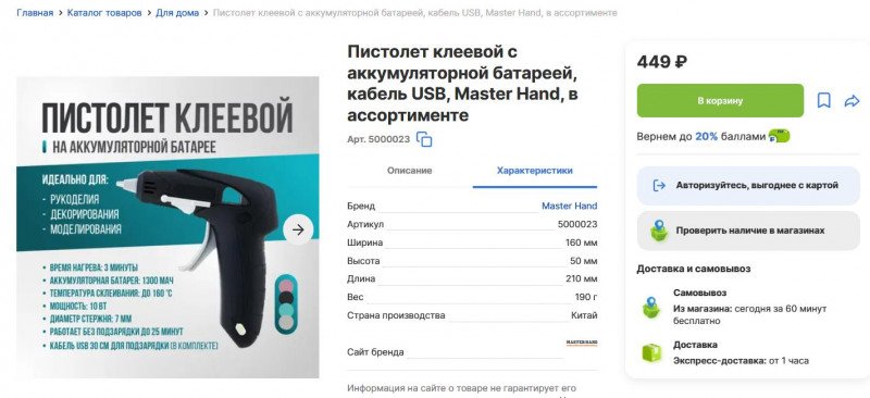 Пистолет клеевой с аккумуляторной батареей, Master Hand, удобно использовать в быту, ремонте и творческих проектах. Заряжается от USB, кабель в комплекте. Подходит для клеевых стержней диаметром 7 мм. Работает без подзарядки до 25 минут. Мощность: 10 Вт. Время нагрева: 3 минуты(меньше на самом деле чуть больше минуты). Аккумуляторная батарея: 1300 мАч. Температура склеивания: до 160 °C. Перед использованием ознакомьтесь с инструкцией и мерами предосторожности на упаковке. Состав: нейлон, литий-ионная аккумуляторная батарея, АБС, алюминий, силикон, сталь, ПВХ, медь, полистирол, полиимид.