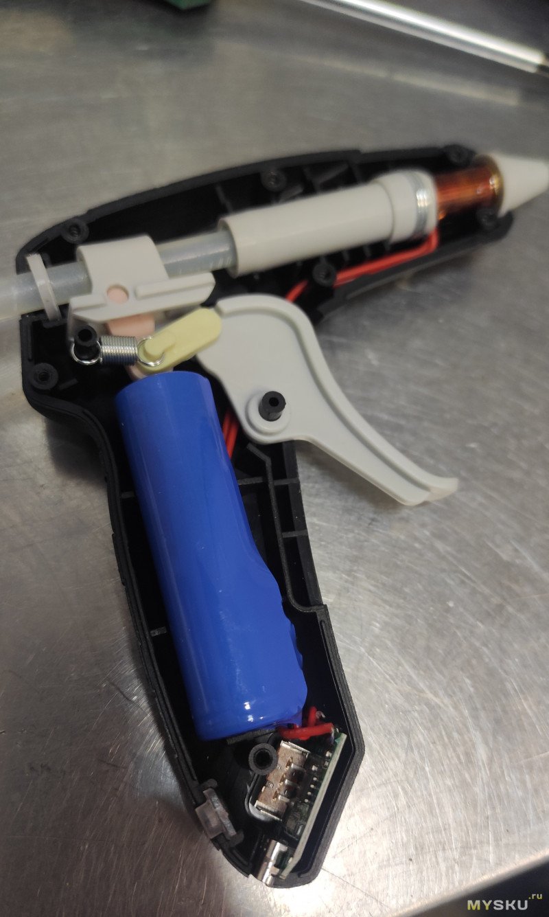 Как-то зашел в Fix Price и увидел пистолет, который мне был не нужен, но взял из любопытства. Поработав с ним немного, расстроился из-за его автономности: три раза включал для недолгой работы — и он разрядился. Спросил у гугла размер АКБ и заказал замену на Ozon (арт. 1812718924). Родной аккумулятор был на 1300 мАч с защитой, ее я перенес на новый.