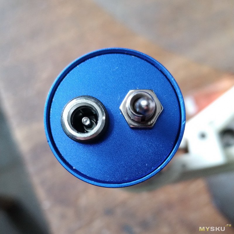 Сверху мини дрели гнездо питания и тумблер вкючения. Корпус металлический, алюминий или дюраль.