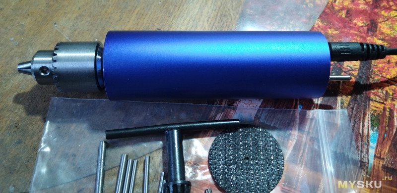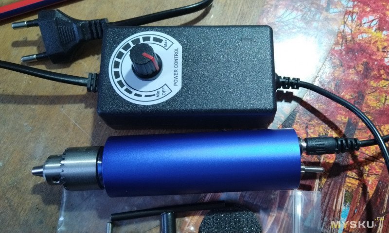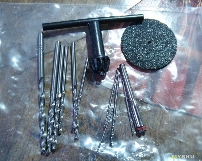 Подкупила цена — 680 р всего. Сейчас уже 900 р. Самое главное это патрон от 0,3 до 4 мм. Заказать такой на Али, не менее 500 р получится. А тут блок питания, коммутация и сам корпус моторчика. БП с регулировкой от 3 в до 12,7 в. В наборе ключ зажимной к патрону, армированный круг, свёрла 10 шт разного диаметра. Инструмент всегда можно докупить.