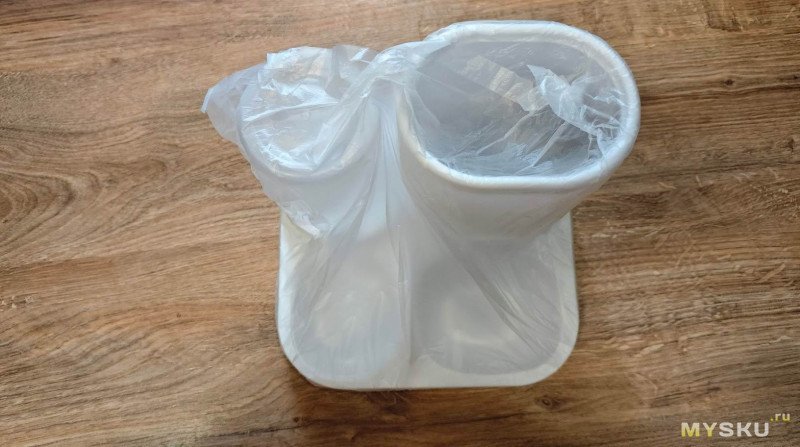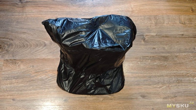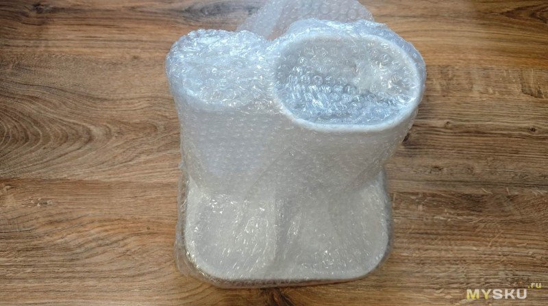 Поставляется кормушка в каком-то чёрном пакете типа мусорного. Под ним слой воздушно-пузырьковой плёнки и еще один прозрачный пакет.