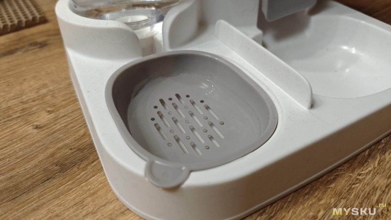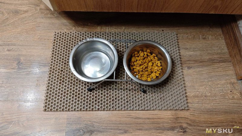 Для собаки мы используем стандартный набор посуды. Две нержавеющие миски на подставке и коврике. Удобно, практично, но ни капли не автоматизировано.