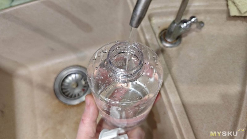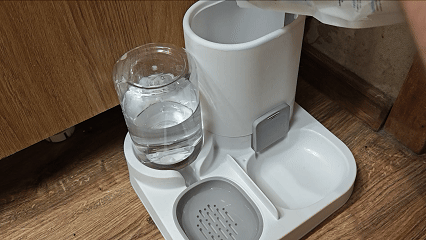 Проверим, как будет с новой системой кормления-поения. Наливаем воду в ёмкость. Мы сами пьём фильтрованную из под осмоса воду и собаку приучили.