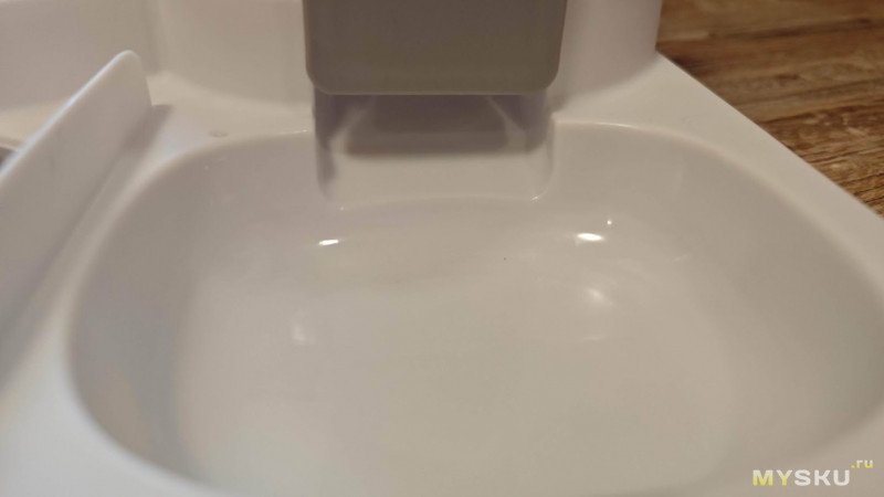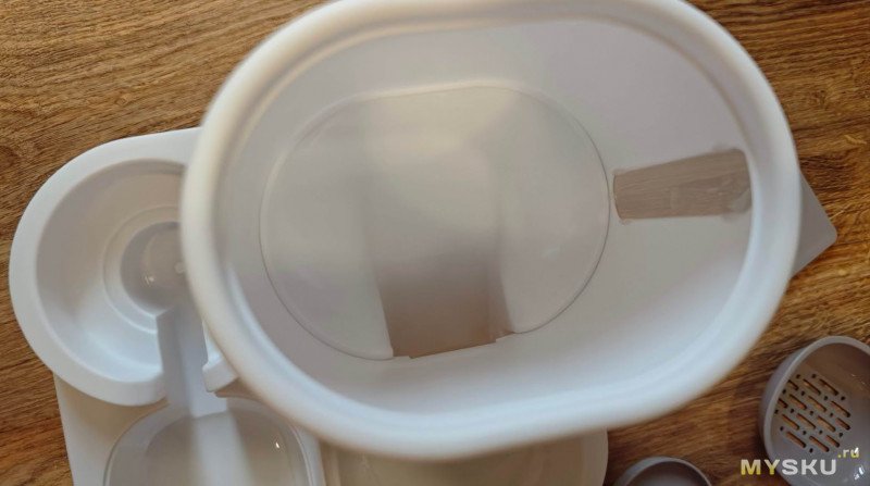 Внутри что-то гремит. Там находится кормушка с корпусом из белого глянцевого пластика и другие детали, но уже из пластика серого цвета.