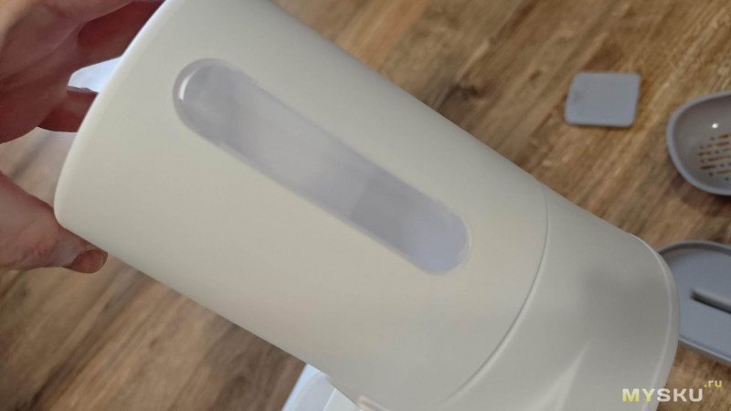 Уровень насыпанного внутри бункера корма можно увидеть сбоку по вытянутому прозрачному окошку.