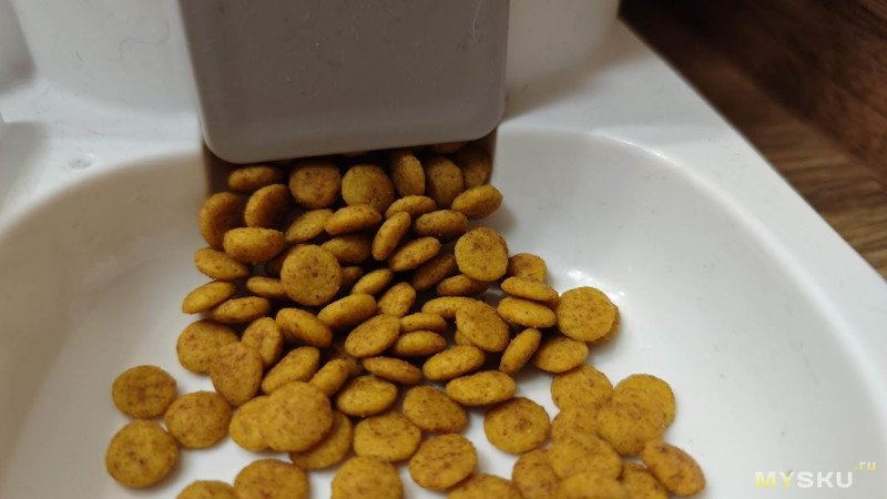 А вот при поедании корма никаких проблем не было, собака съела сколько ей надо и сытая отошла от кормушки. Но это на глаз, надо будет последить за её весом.