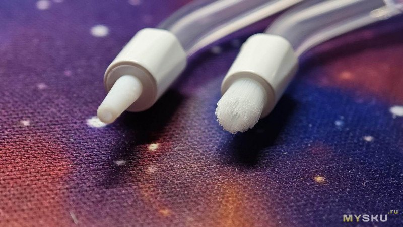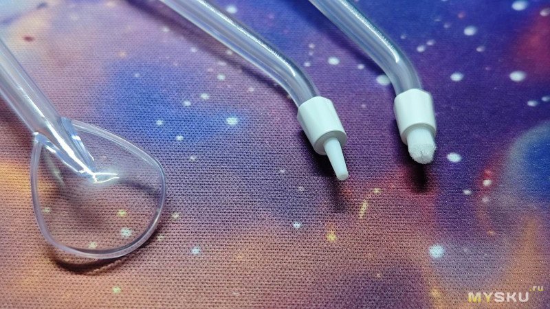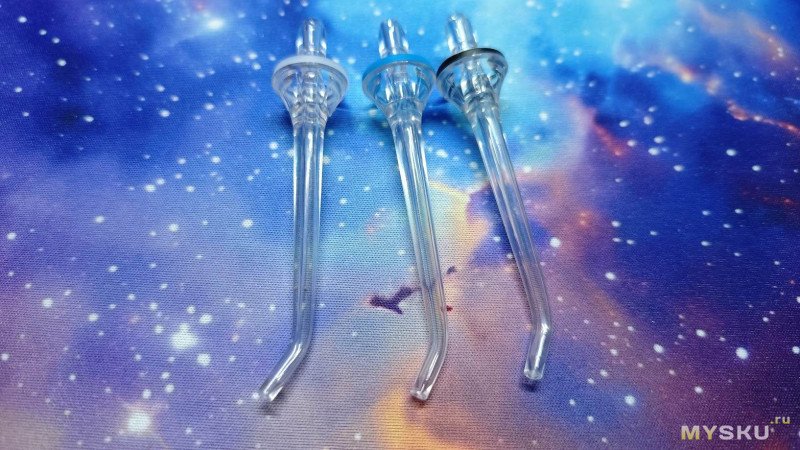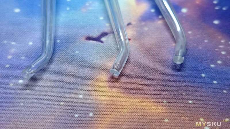 Они имеют загнутые кончики и узкие каналы для подачи струи под напором. Предназначены для ежедневной очистки межзубных промежутков и удаления налёта в тех местах, куда не достаёт зубная щётка.