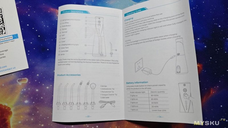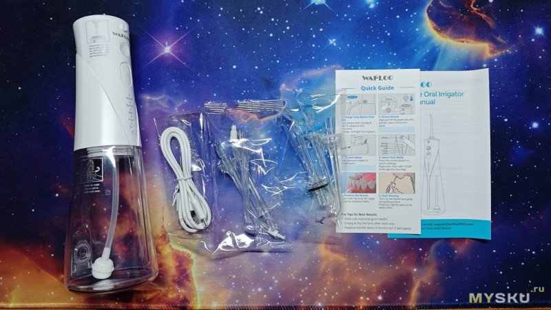 Внутри находится сам ирригатор, два комплекта различных насадок, кабель для зарядки, гарантийный талон и инструкция по эксплуатации.