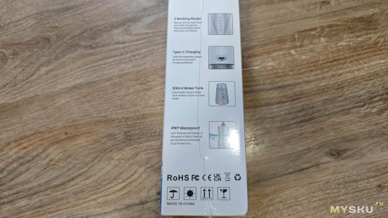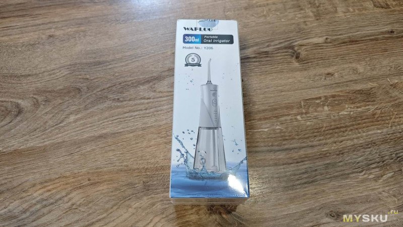 Поставляется ирригатор в продолговатой иллюстрированной картонной коробке, полностью затянутой в плёнку. По бокам коробки находится описание ключевых функций устройства.