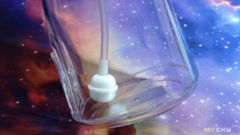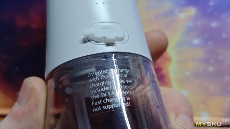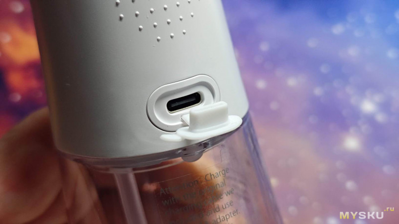 С обратной стороны находится ещё одна наклейка, которая предупреждает, что использование быстрых зарядок не желательно. Зарядный порт Type-C установлен в корпусе помпы и закрыт силиконовой заглушкой.