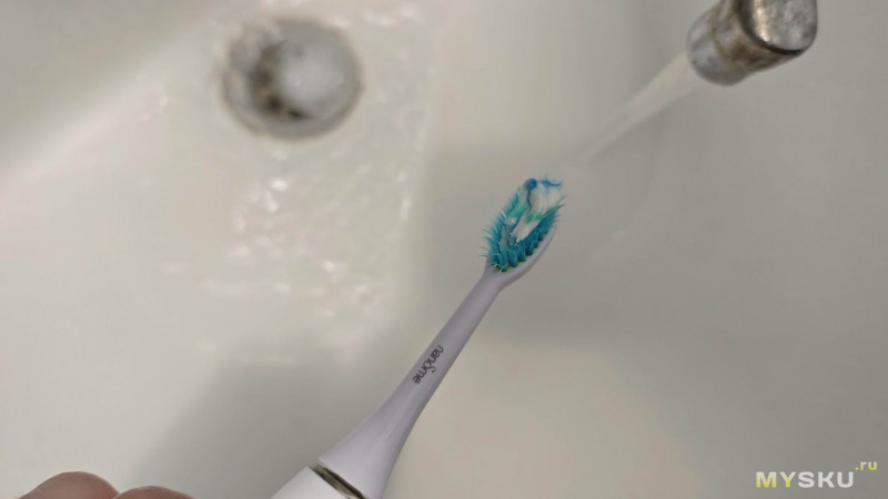 Поэтому сначала чистим зубы электрической зубной щеткой, а уже потом испытываем этот диковинный для меня агрегат.
