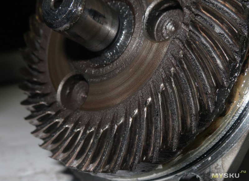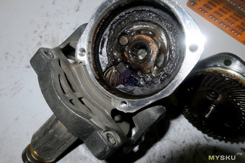 Пришло время осмотреть редуктор.Никаких закусываний и подозрительных тресков когда машинка работала замечено небыло.Коническая пара конечно уже подизношена и смазка требует замены.Опорный игольчатый подшипник в норме.