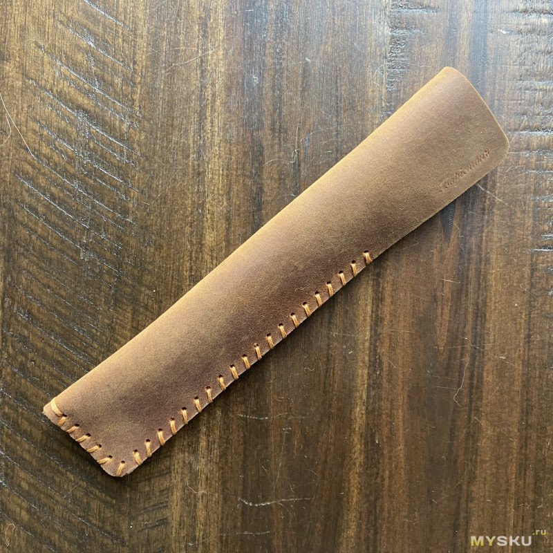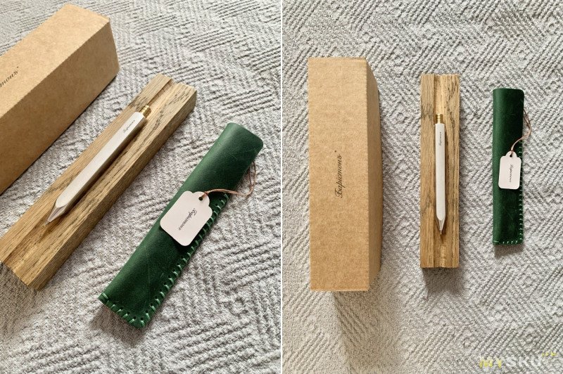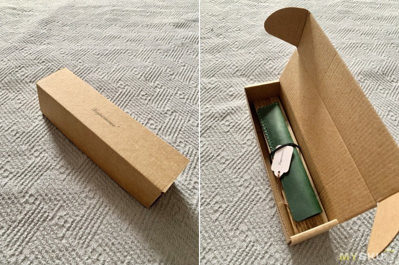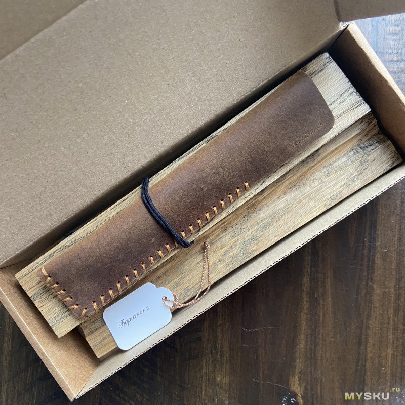 Начну с упаковки — и она на высоте. Коробка из плотного картона, внутри которого лежат подставка под ручку (дуб, пропитанный маслом и обработанный воском), кожаный чехол, внутри которого лежит ручка. Прямо вот идеальный подарок.