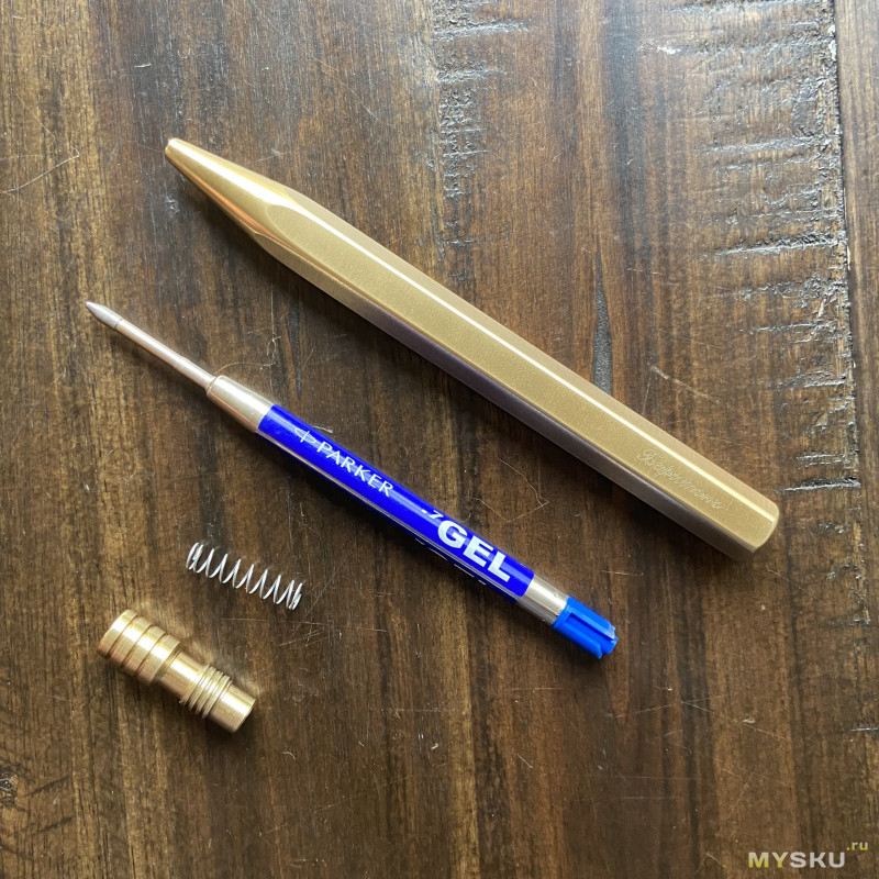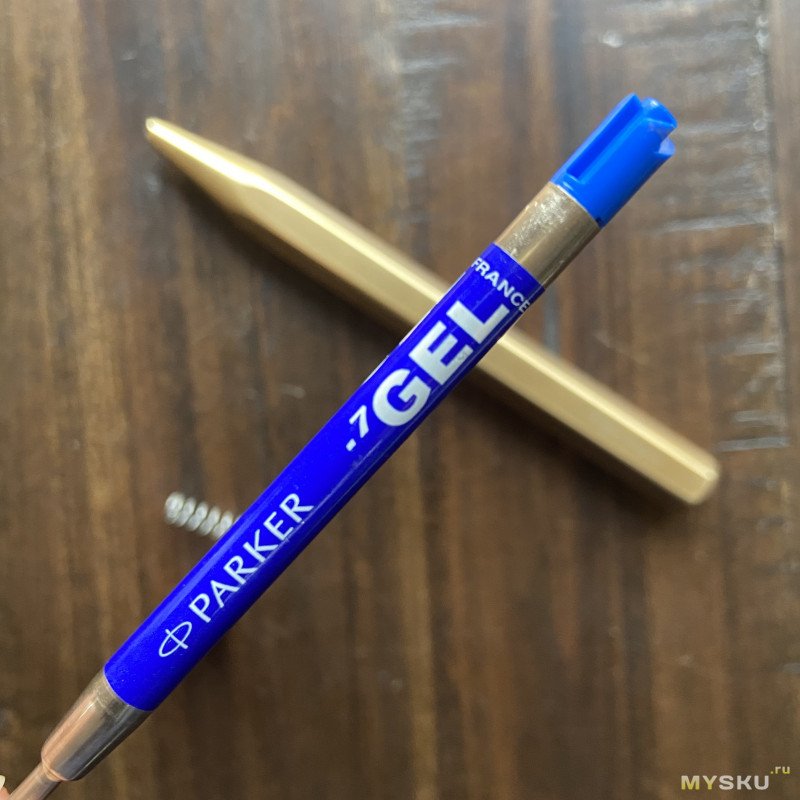 И оказывается, что у ручки минимальное количество деталей — корпус, пружинка, прижимной механизм и стержень. Формат стержней — Parker G2, я выбрал гелевый синего цвета (так что формально у меня не шариковая ручка, но гелевая).