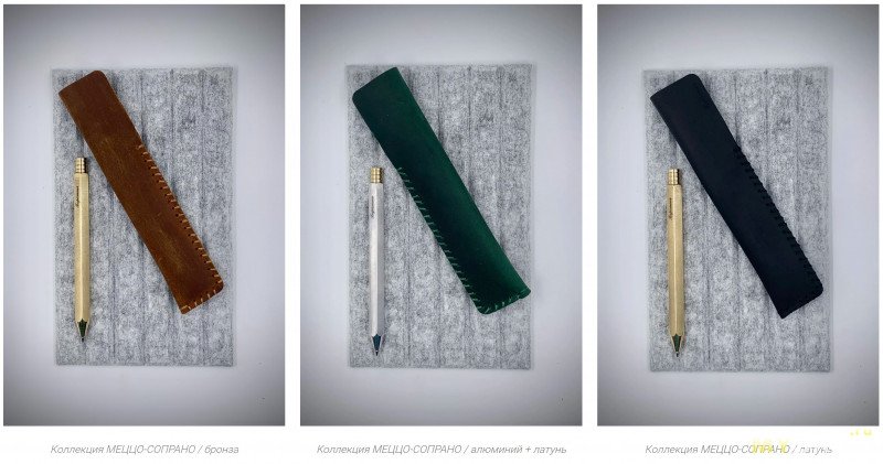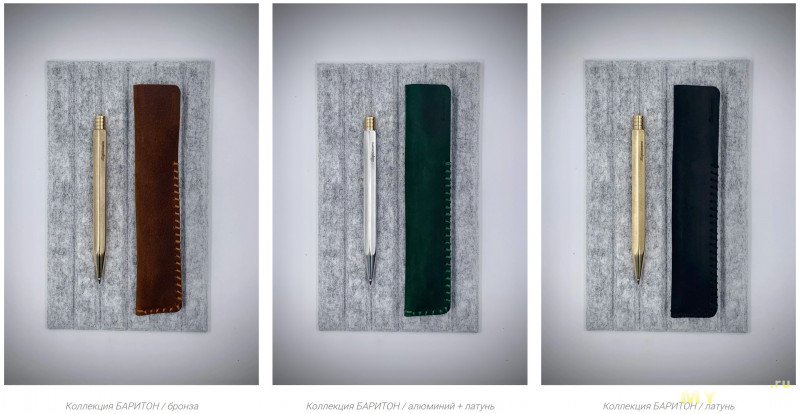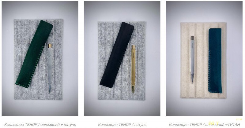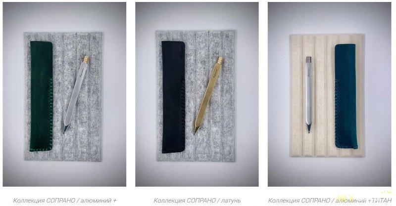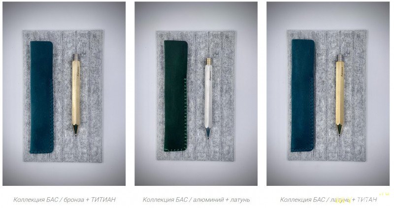 Каждая из моделей ручек представлена в разных материалах (бронза, алюминий, латунь), с разными геометриями корпуса (круглый, квадратный, шестигранный) и наконечника (изящно-длинный или брутально-укороченный) и разными стержнями — гелевый или шариковый (чёрного или синего цвета). А ещё есть опция с прижимным механизмом, сделанным из титана.