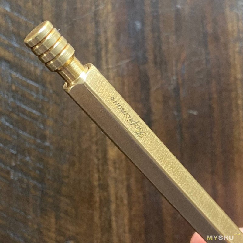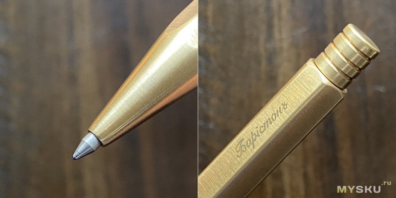 Торцы ручки обработаны на грубом камне, грани же, наконечник и прижимной механизм тщательно отполированы. На торце ручки — прижимной механизм, на одну из граней нанесено гравировкой название бренда.