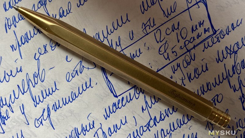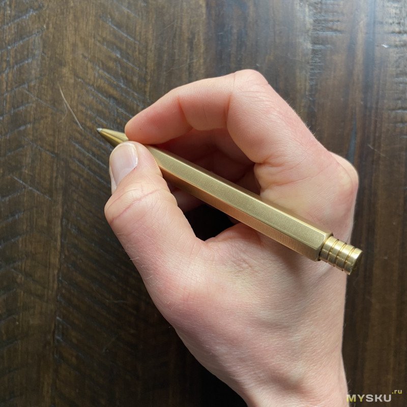 Ручка в руке лежит, как я это уже отметил выше, идеально — я люблю пишущие инструменты потяжелее, поэтому и выбрал бронзу. Пальцы идеально легли на грани, ничего нигде не мешается, писать ручкой — одно удовольствие.