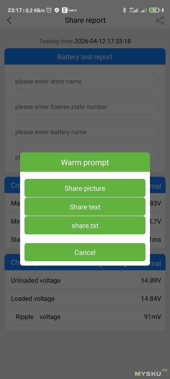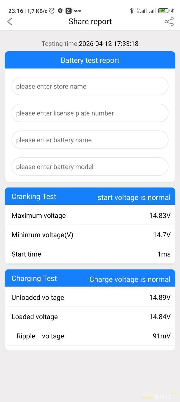 Там можно заполнить название организации, которая делает тест, номер авто, марку и модель батареи. И приложение само подтягивает данные из последних тестов прокрутки и теста зарядки.