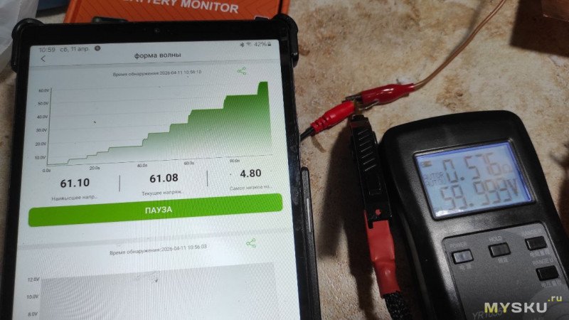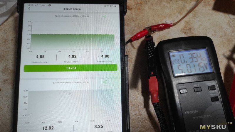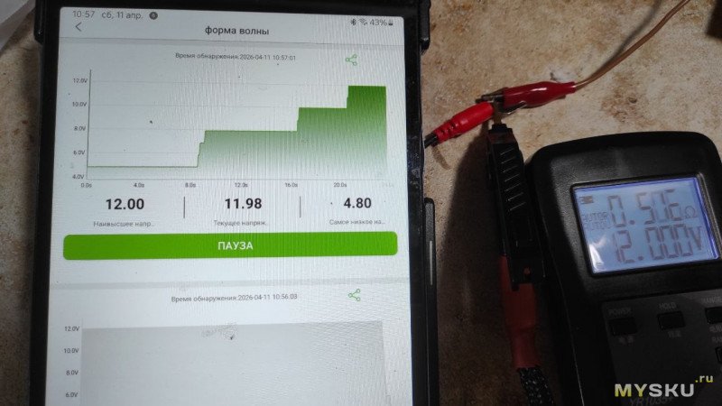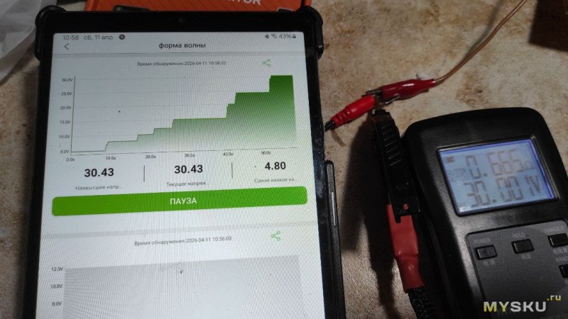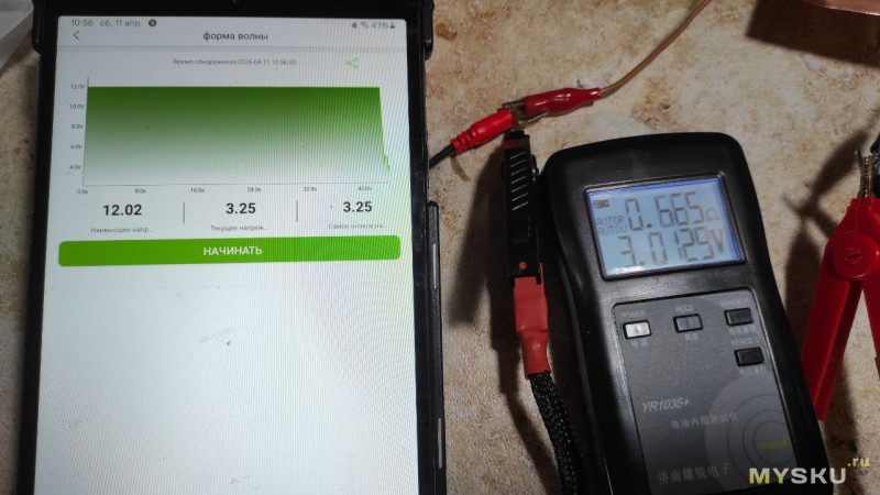 Для получения графика нужно нажать «Начинать» и прибор показывает график, под ним показывает минимальное, текущее и максимальное напряжение. Измеряет 5 раз в секунду.