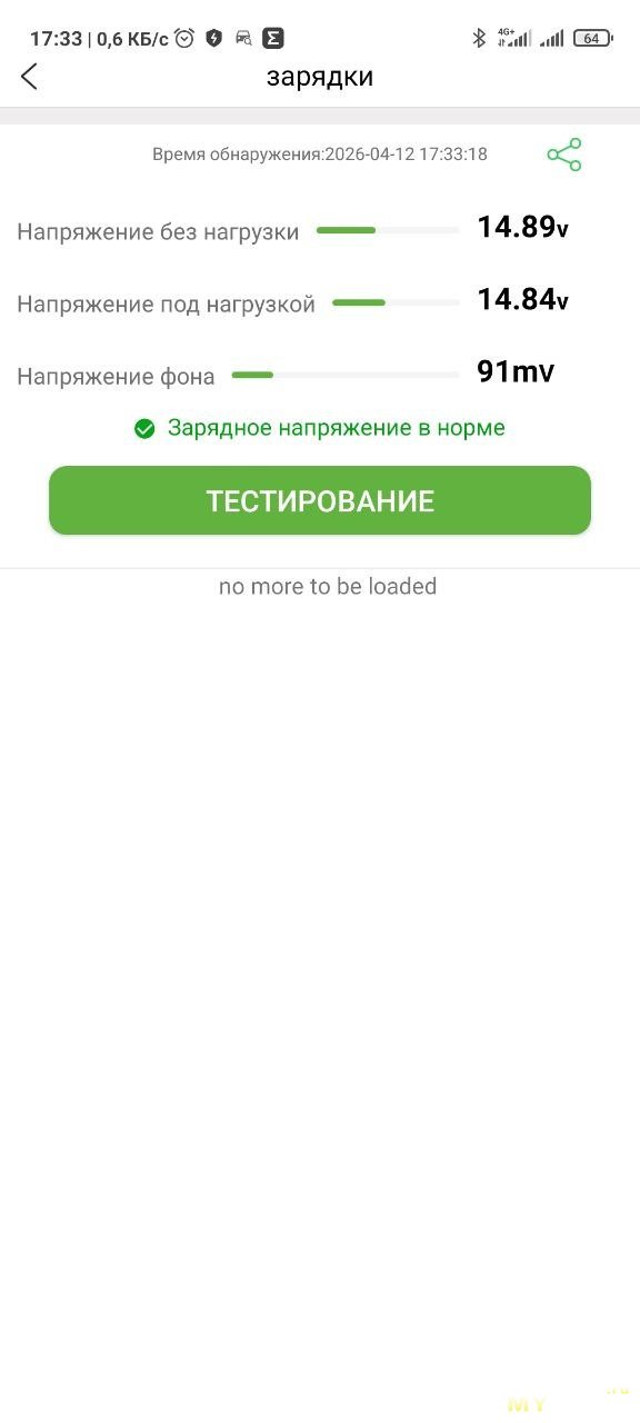 В конце показывается отчет. При этом видимо напряжение без нагрузки это напряжение на холостом ходу, напряжение под нагрузкой это напряжение при оборотах 2500. Ну и разница между этими напряжениями.