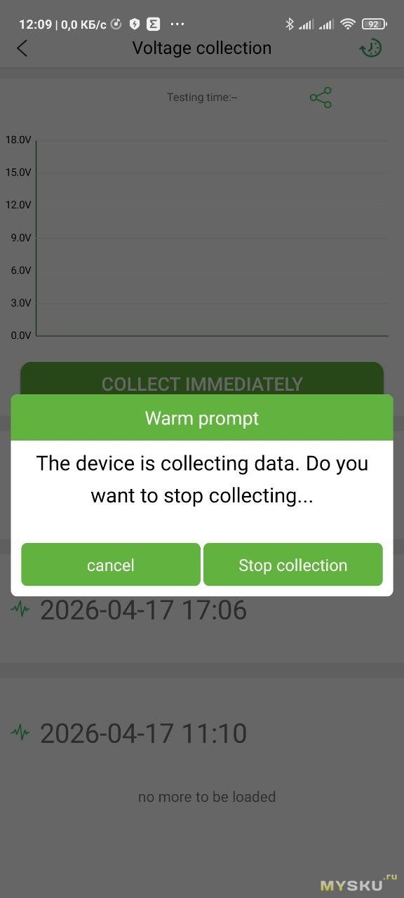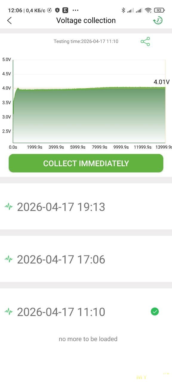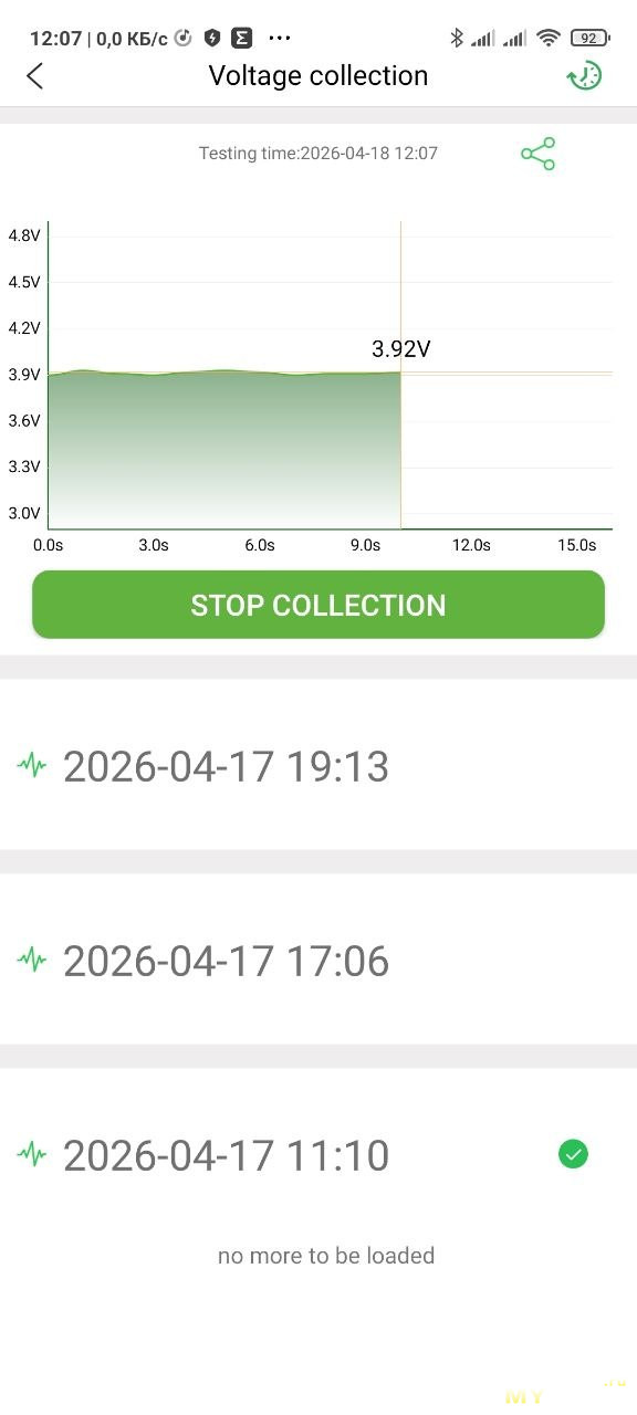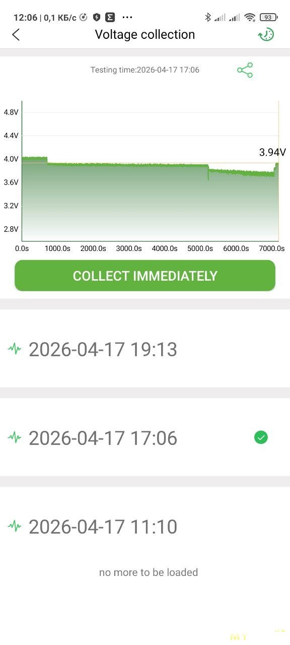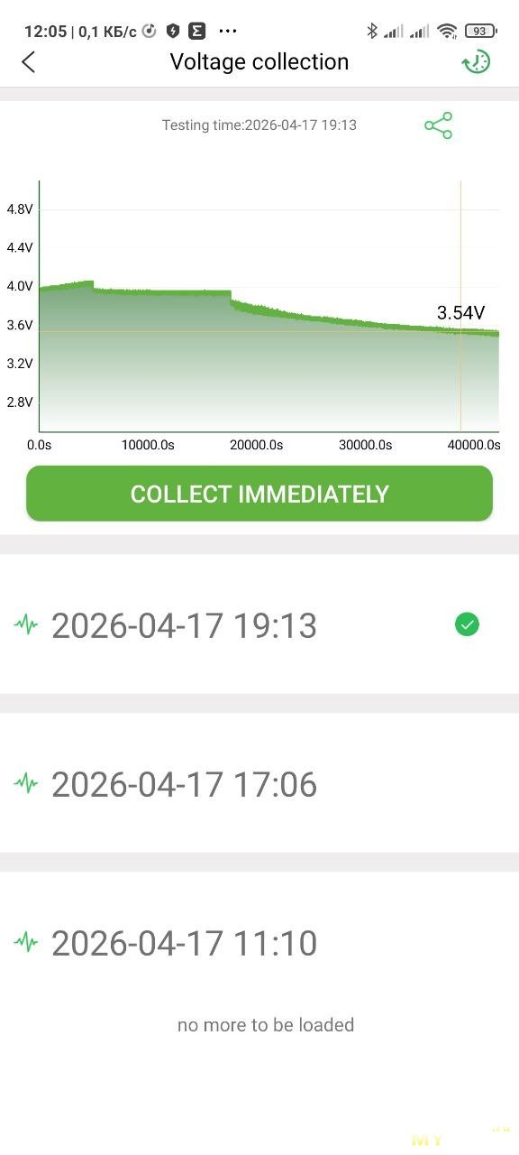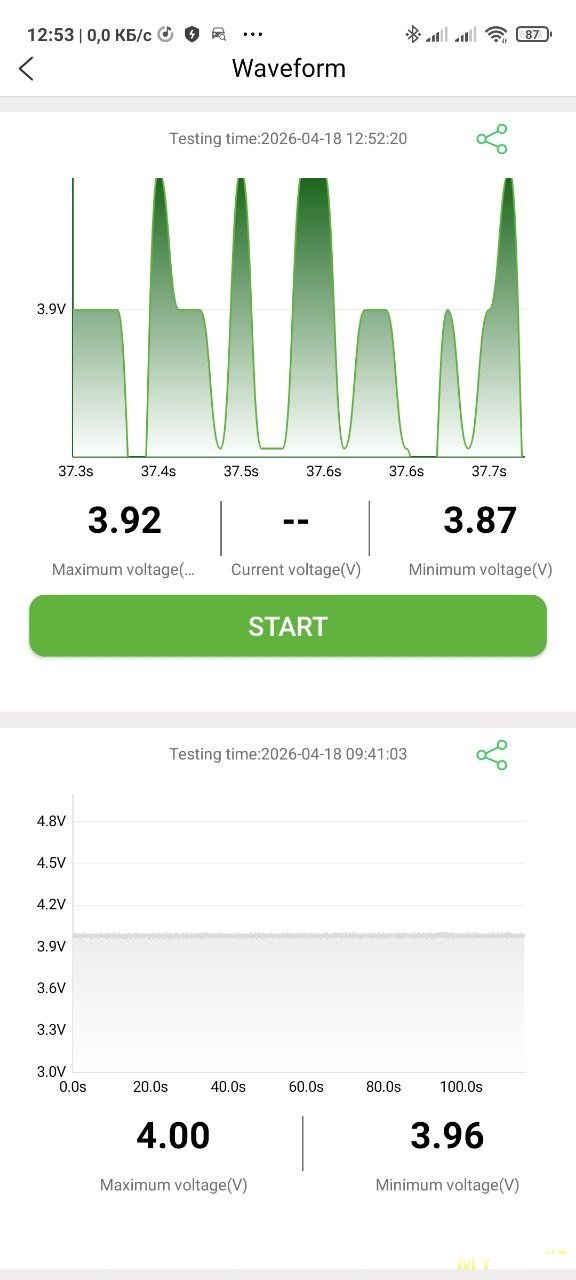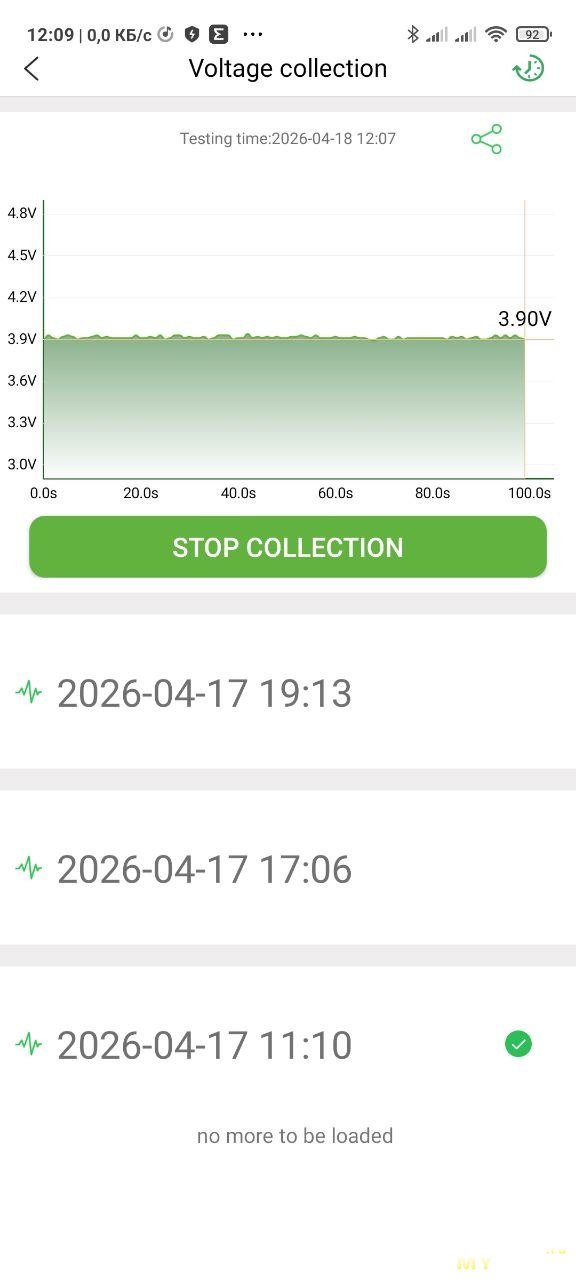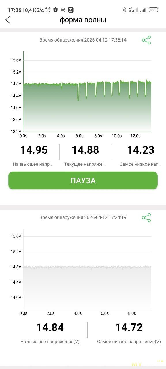 И логер будет записывать напряжение в свою память, держать телефон рядом не нужно. Потом можно подключиться и увидеть результат записи. На фото ниже две записи — два логирования.