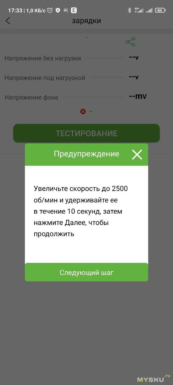 И последний режим это тест заряда или «зарядки» в кривом переводе. При этом всплывают инструкции типа «заведите авто». «Увеличьте скорость до 2500 об/мин и удерживайте ее в течение 10 секунд». После нажатия «следующий шаг» идет обратный отсчет 10 секунд.