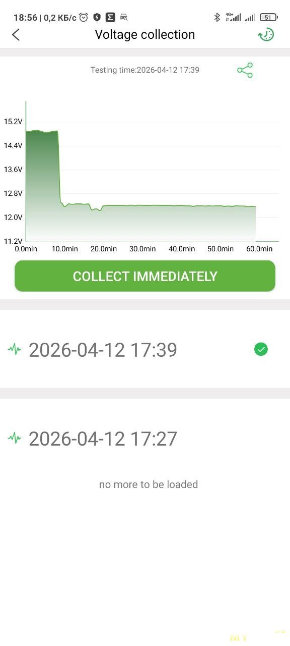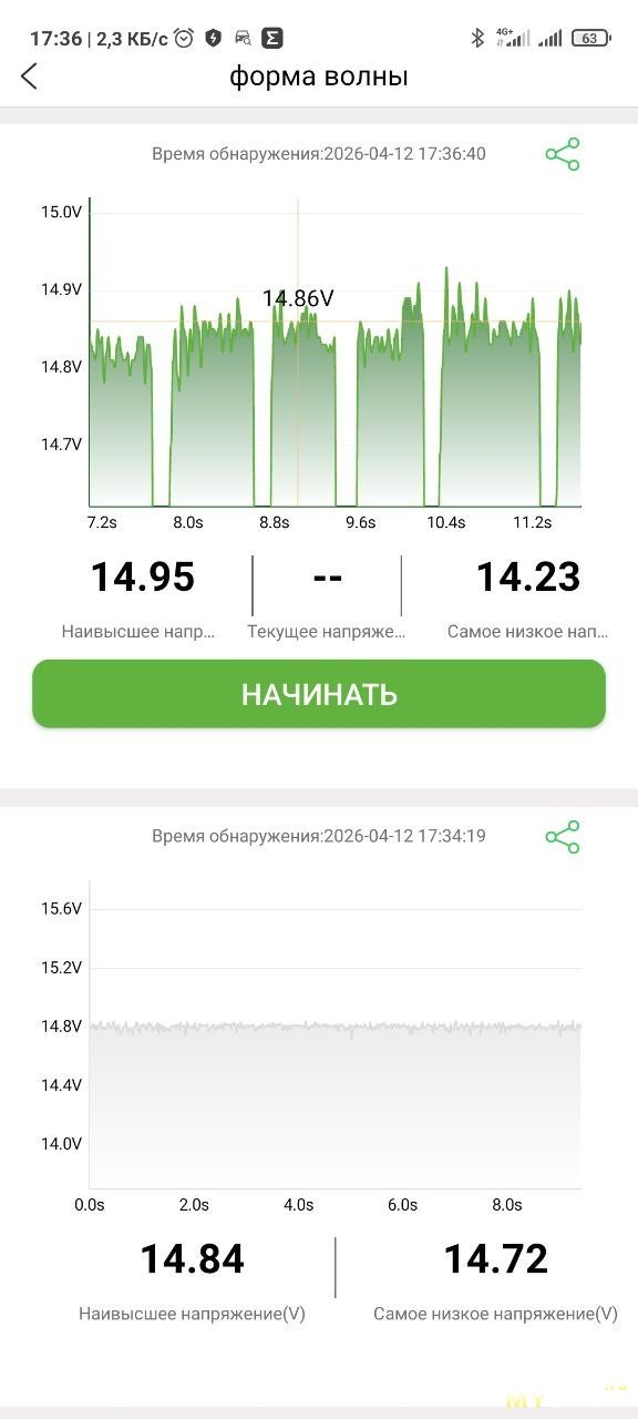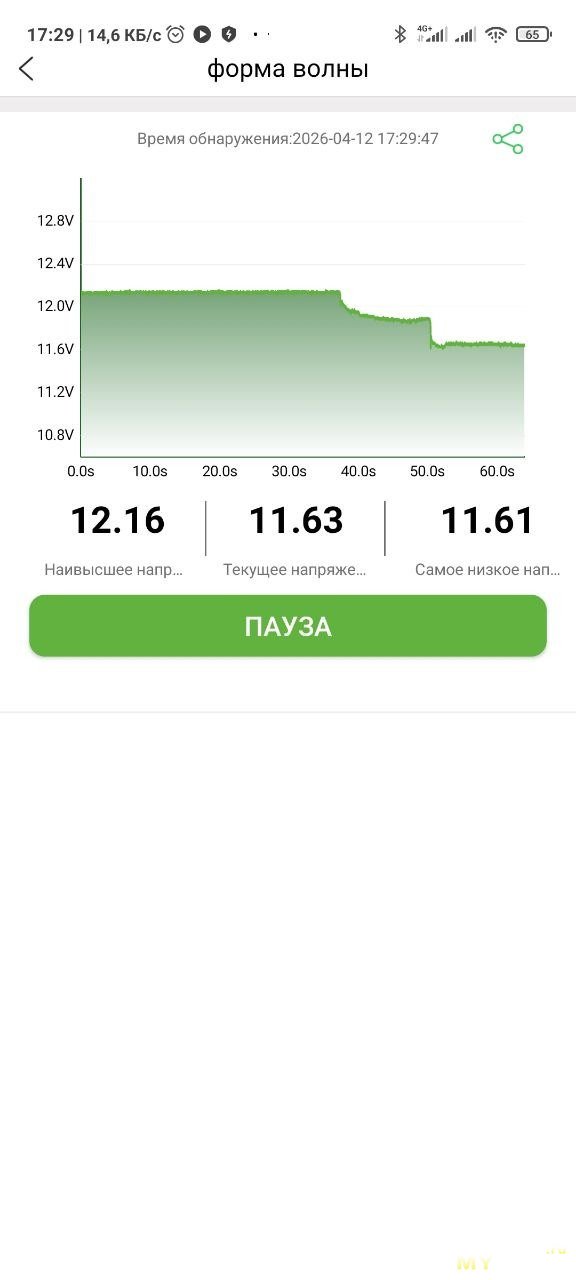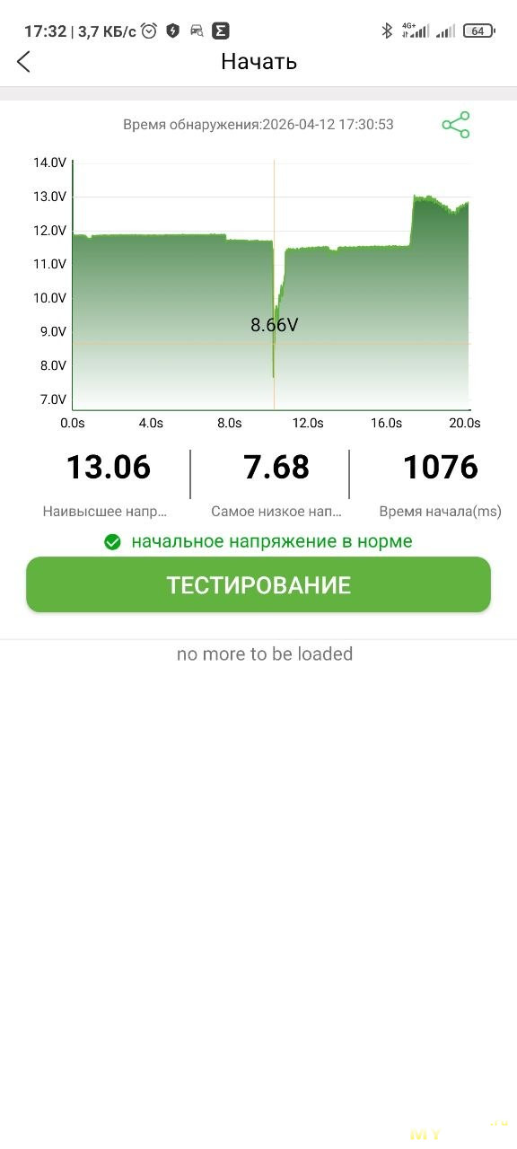 В этом режиме нужно завести авто, когда приложение это попросит. После окончания теста можно масштабировать график и выбрать любую точку на графике — покажет напряжение. Показывает минимальное и максимальное напряжения, похоже показывает время до запуска.