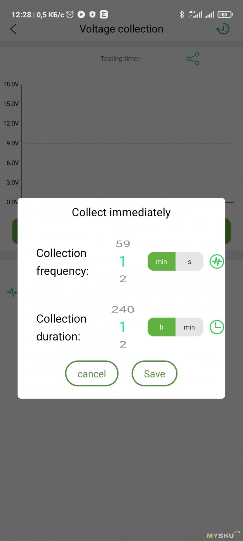 Приложение предлагает выбрать период записи от 1 секунды до 60 минут и период записи от 1 минуты до 240 часов