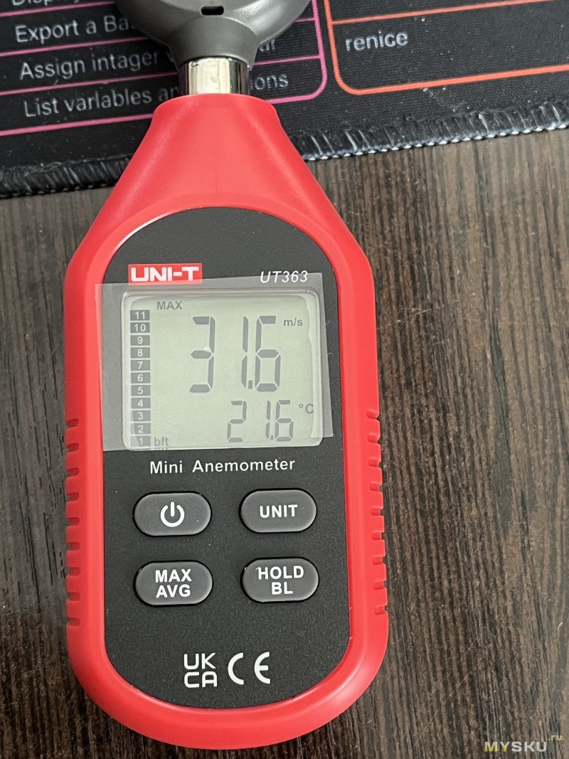 Мы с вами условились, что проверять прибор будем с расстояния 30 сантиметров, дудя на дешевенький анемометр.