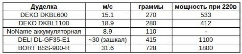 Сравнительная таблица воздуходувок, на которые уже написаны обзоры: