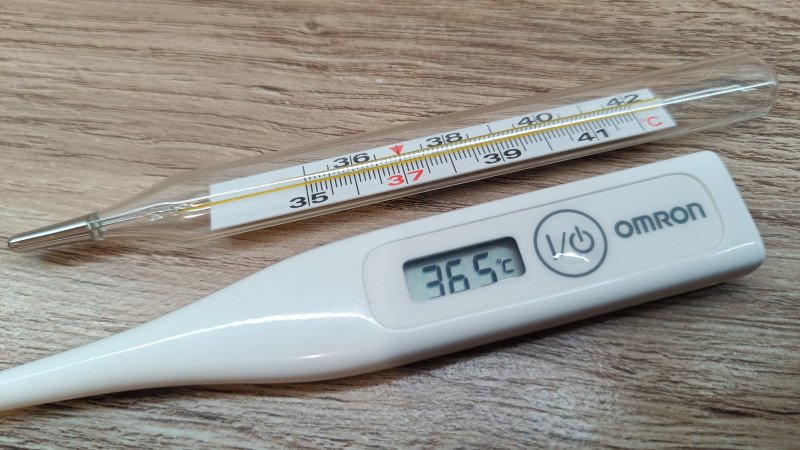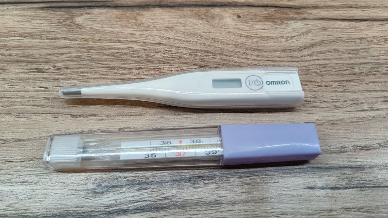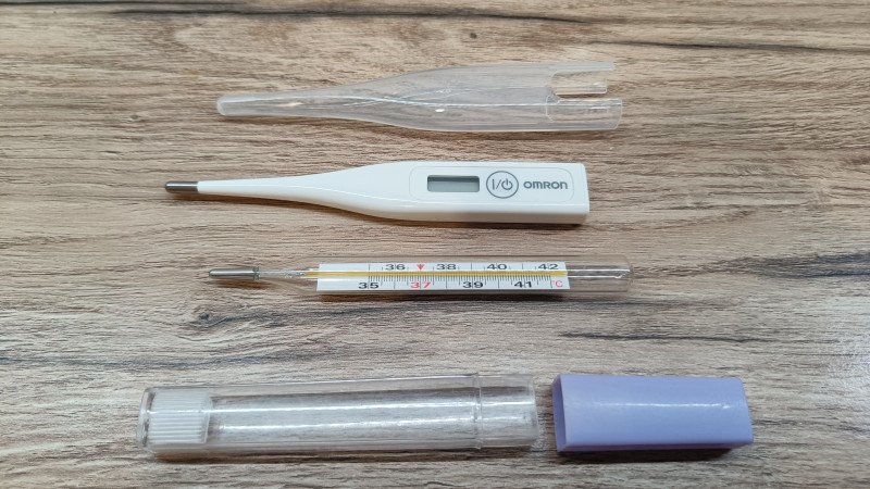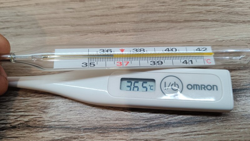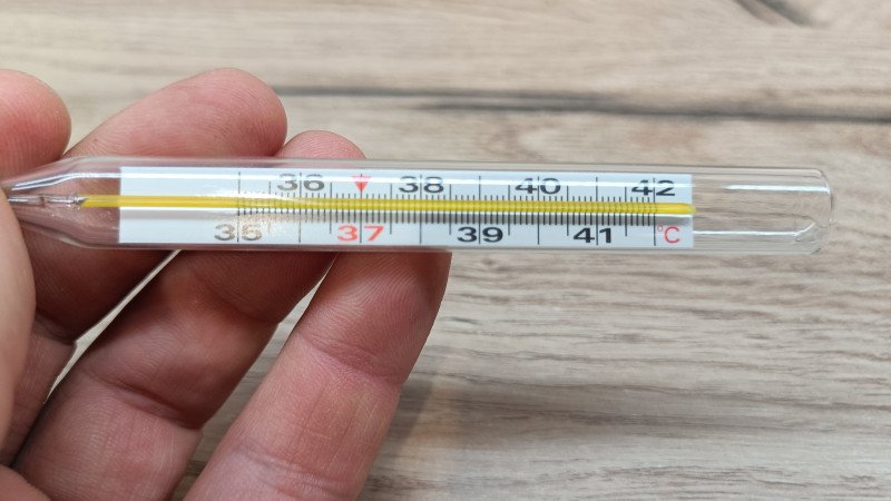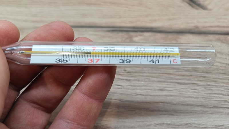 Измерение температуры будем проводит штатным способом, разместив оба градусника под мышкой. Перед измерениями ртутный градусник необходимо скинуть в рабочее положение, встряхнув его до положения ниже 36 градусов.